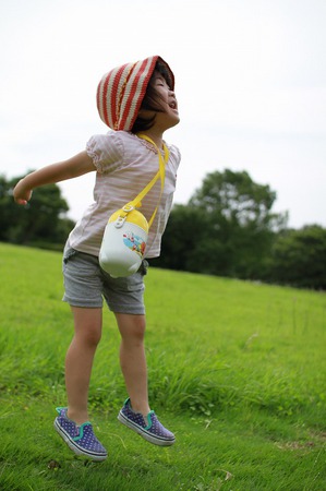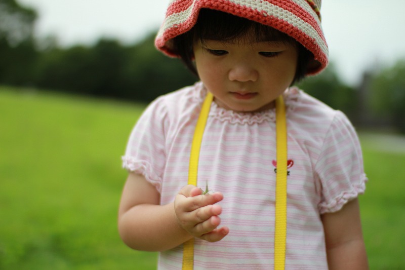 バッタを見つけて初めての至近距離観察に不思議顔。その後、当然「あづちゃんバッタダイスキ~」となる。